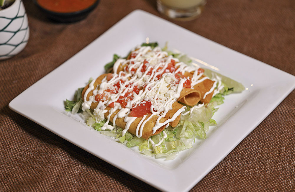 4 taquitos filled with cheese on bed of lettuce, topped with sour cream, cheese and tomatoes.
