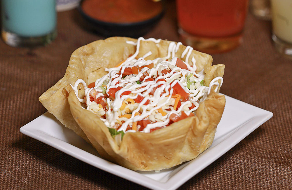 Crispy flour tortilla shell filled with beans, lettuce, tomato, sour cream, and cheese. Your choice of ground beef or chicken.