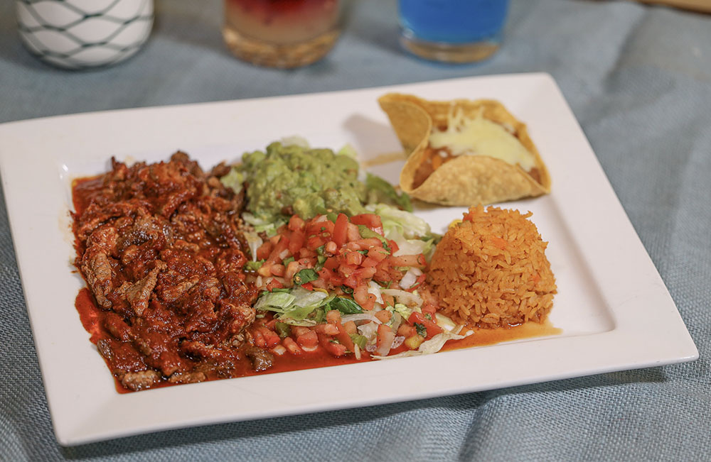 Choice of steak tips or chicken cooked in a guajillo sauce, served with rice, beans, guacamole, lettuce, pico de gallo and tortillas.