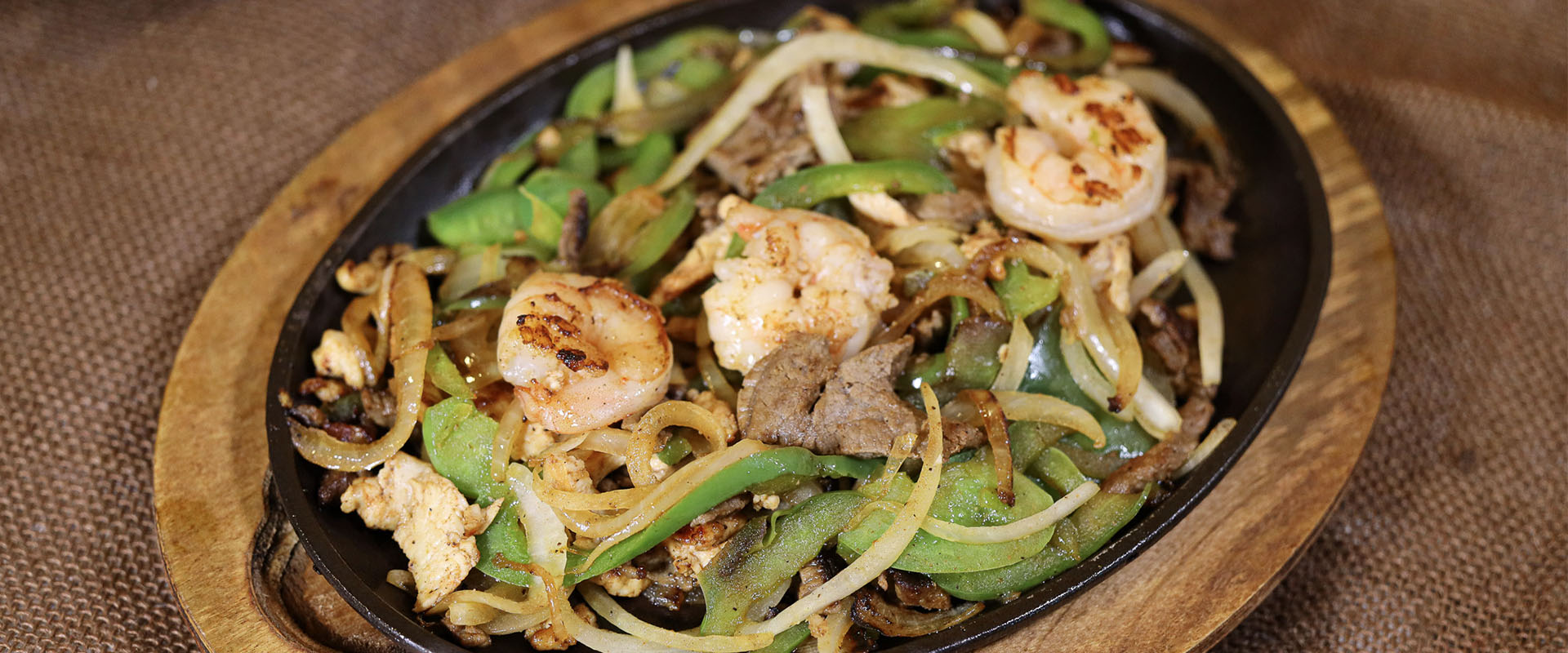 Great for sharing - a delicious combination of sizzling chicken, steak, shrimp and chorizo.