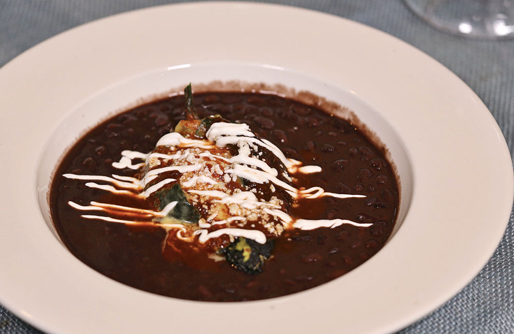 Poblano pepper stuffed with cheese covered in roasted tomato and arbol salsa. Served on black beans.