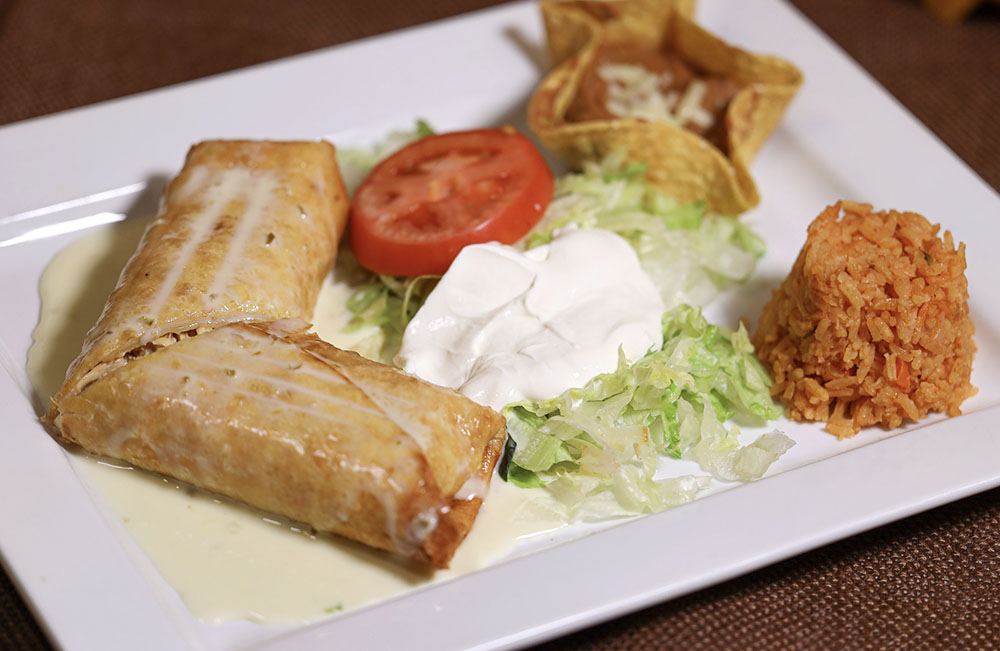 Deep fried flour tortilla stuffed with chicken or beef, served with rice, beans, sour cream and tomato.